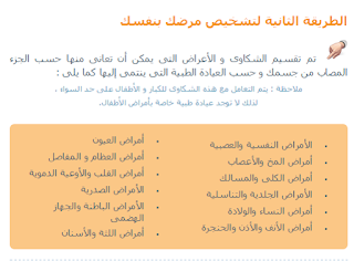 بعد الضغط على شخص مرضك بنفسك في الطريقة الأولى تظهر لك نافذة تطلب منك اختيار ما تشكو منه بالضبط، قبل الدخول في تفاصيل المرض عن طريق أسئلة يطرحها الموقع وتقوم أنت بالإجابة عنها عن طريق تحديد ما تشكو منه .