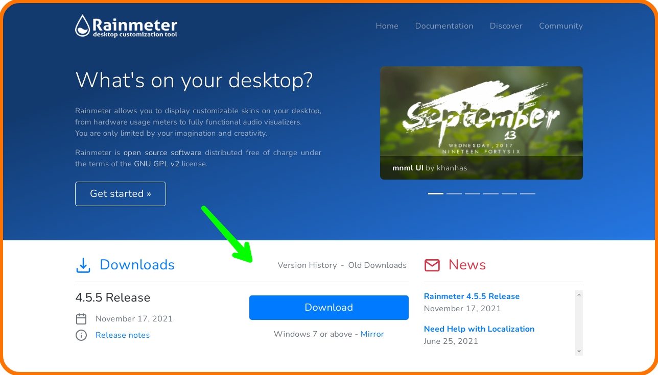 يأتي Rainmeter في نسخة حديثة تحمل الرقم 4.5.5، ويمكنك تنزيلها بالضغط على الخيار Download.